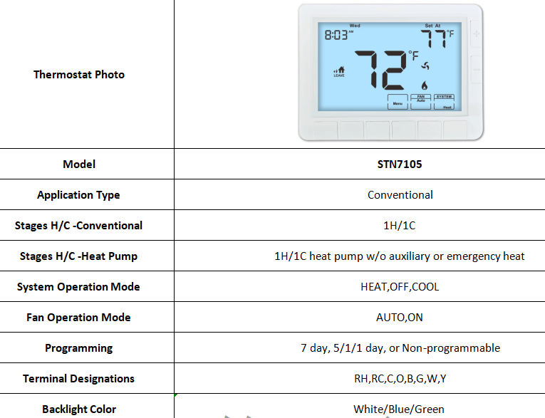 El STN7105 sirve como un controlador de termostato digital versátil, compatible con los sistemas convencionales de calefacción y refrigeración.Soporta una configuración de bomba de calor 1H/1C sin calor auxiliar o de emergencia, lo que lo convierte en una opción de termostato de motor eficiente para varias configuraciones de HVAC.