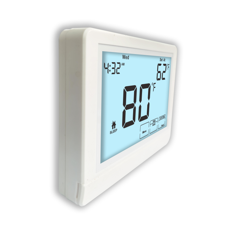 La pantalla del termostato es otra característica clave que mejora la interacción del usuario. Con un tamaño de pantalla de 8.18 pulgadas cuadradas, ofrece una interfaz clara y fácil de leer. El área de visualización grande asegura que la configuración de la temperatura y la información de programación sean visibles de un vistazo, reduciendo la necesidad de ajustes repetidos y minimizando los errores del usuario. Además, la función de retroiluminación admite múltiples opciones de color (blanco, azul y verde), lo que permite a los usuarios elegir la iluminación más cómoda y visualmente atractiva para su entorno. Esto es especialmente beneficioso en habitaciones o instalaciones con poca luz, donde las condiciones de iluminación varían a lo largo del día.
